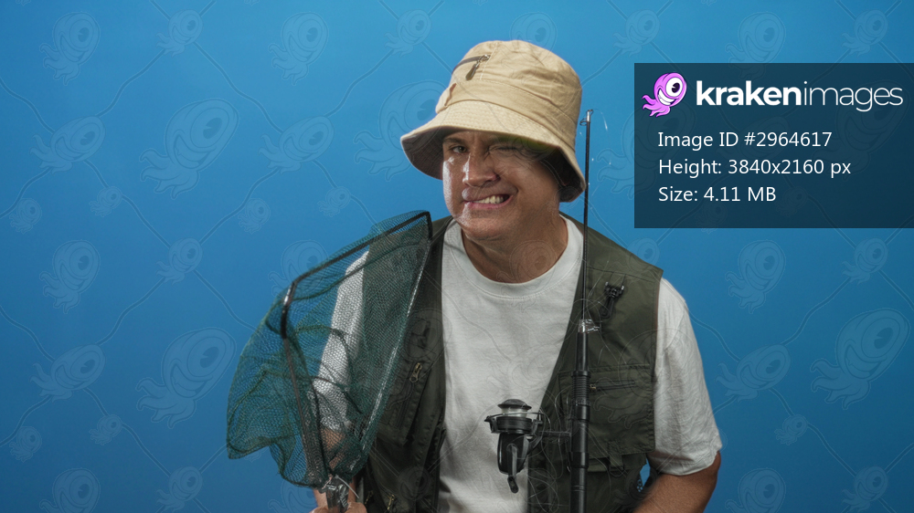Man fisherman wearing bucket hat and fishing vest holds a landing net and rod, smiling in studio; leisure contentment.