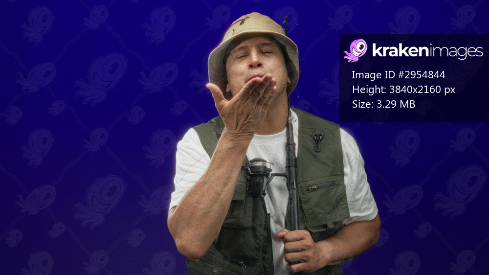 Man fisherman wearing bucket hat and vest holds a fishing rod and blows a kiss with his bare hand in studio; friendly greeting joyful.