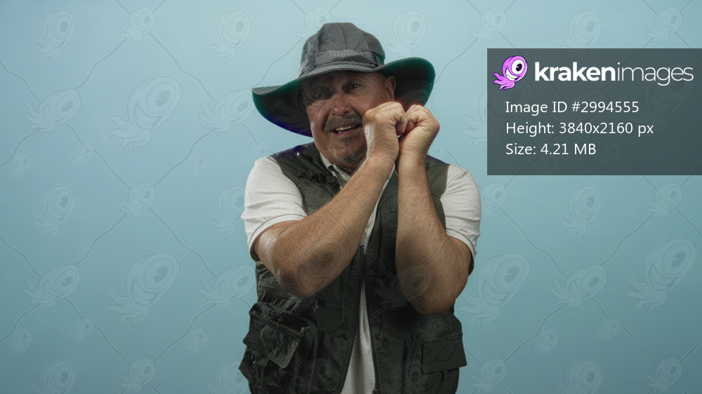 Man fisherman wearing wide brim hat and fishing vest clasps hands near cheek and smiles in studio portrait; playful contentment.