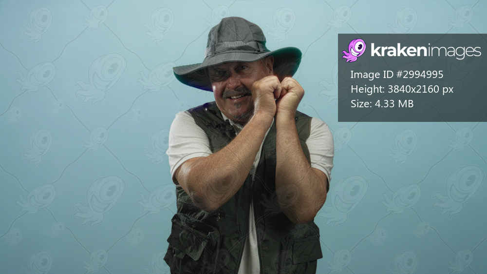 Man fisherman wearing wide brim hat and fishing vest clasps hands near cheek and smiles in studio portrait; playful contentment.