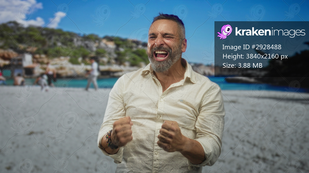 Man with fists clenched and mouth open shouting in studio beach scene, middle age hispanic with grey hair and beard wearing linen shirt; joy triumph.