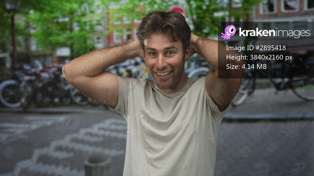Man with fists raised and bare forearms visible on a busy city street, smiling broadly while holding celebratory pose; joy celebration.