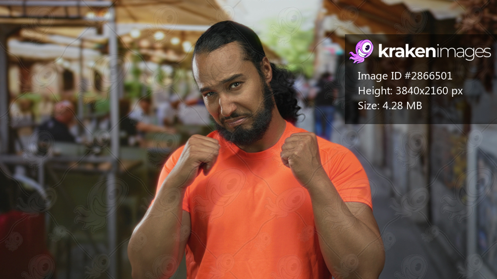 Man with fists raised and beard in bright orange shirt standing at a street cafe terrace outdoors, facing camera; concern resilience resolve.