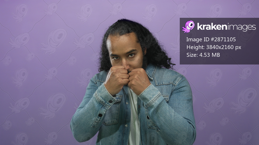 Man with fists raised in boxing guard wearing denim jacket in studio against purple backdrop; strength determination.