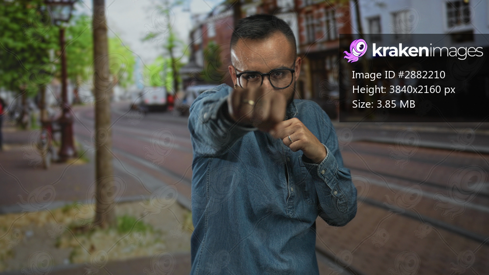 Man with fists raised in boxing pose on a city street near tram tracks wearing denim shirt and glasses; determination grit.