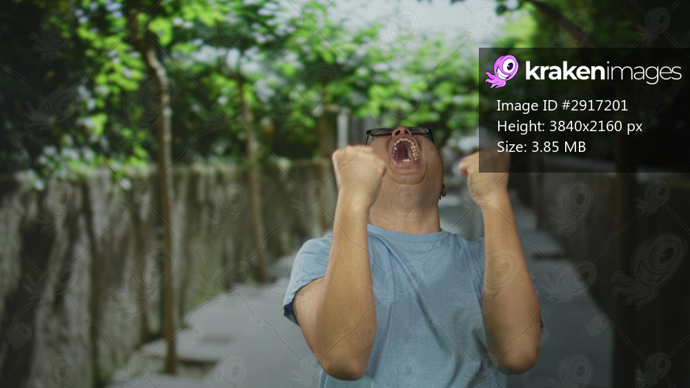 Man with fists raised and mouth open shouting on a street lined with trees and stone walls, wearing glasses and a light blue t shirt; joy celebration.