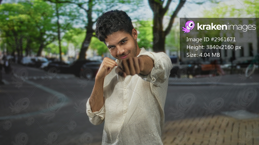 Man with fists raised near chin revealing bare forearms on tree lined street, wearing linen shirt and red bracelet; confidence friendly.