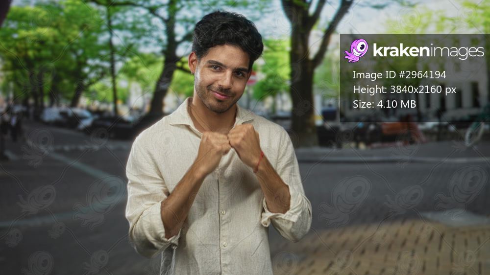 Man with fists raised near chin revealing bare forearms on tree lined street, wearing linen shirt and red bracelet; confidence friendly.