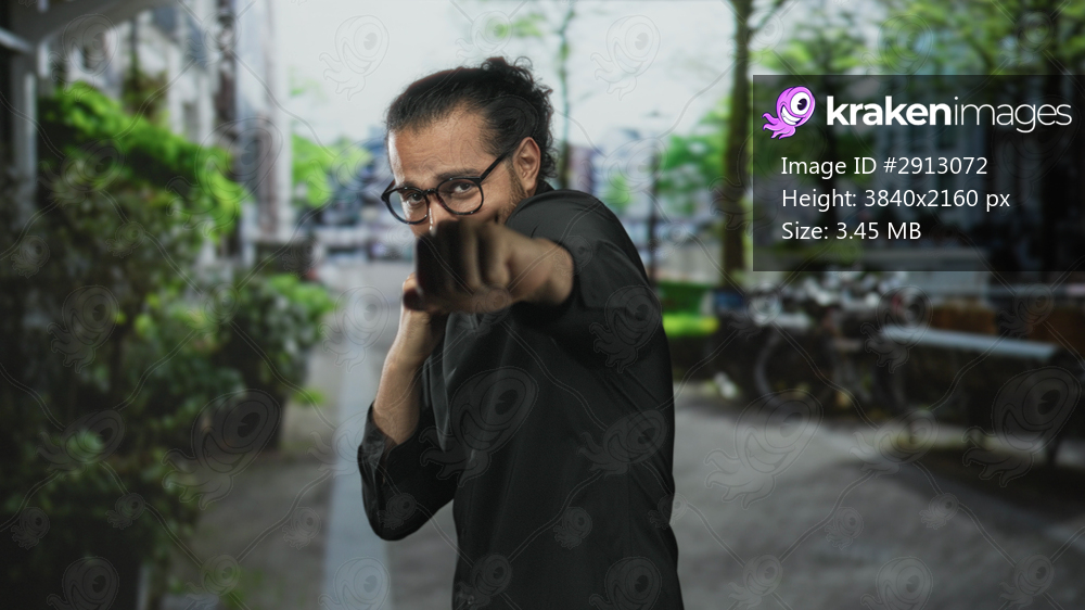 Man with fists raised on street wearing black shirt and glasses, punching toward camera; confidence fitness training.