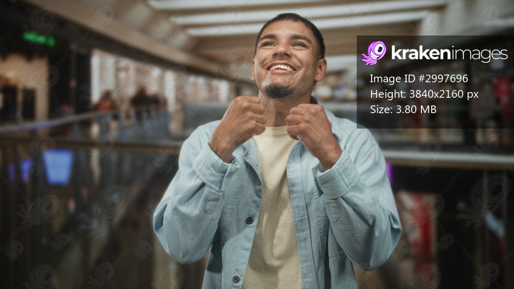Man with fists raised and smiling in a playful boxing pose inside a building shopping mall walkway; joyful confidence.