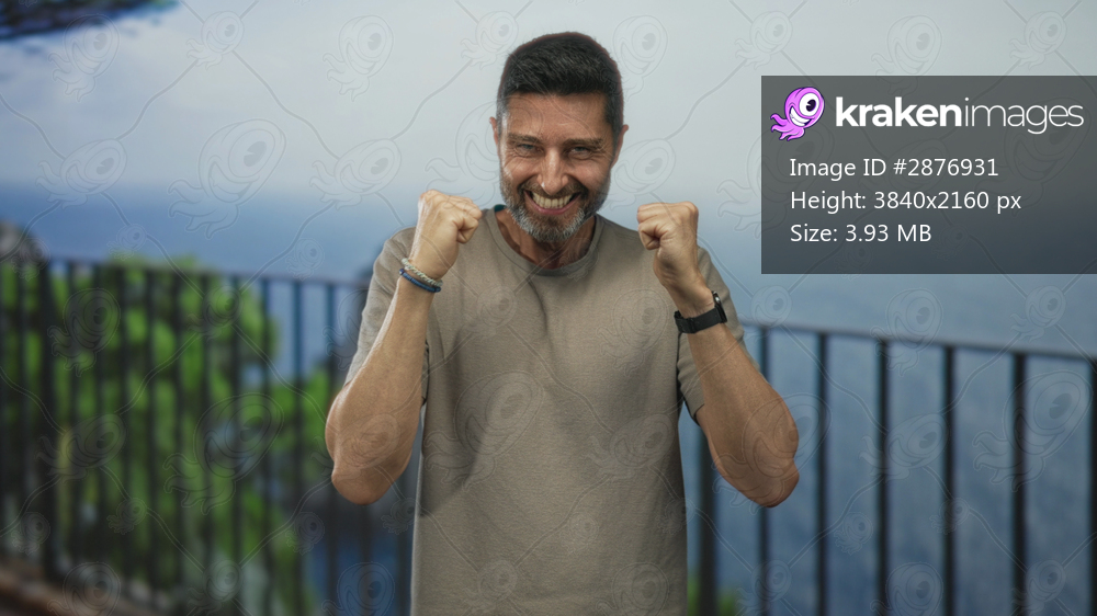 Man with fists raised and smiling on a building balcony overlooking the sea, wearing watch and bracelet, short beard and tan t shirt; joy triumph success. - Kraken Images