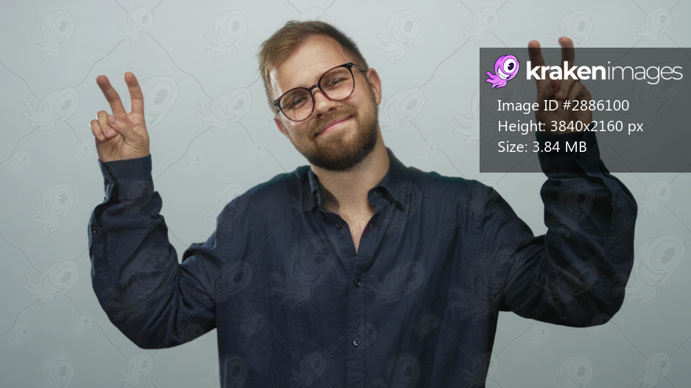 Man flashing peace signs with both hands in studio against pale gray backdrop, wearing navy shirt and glasses; cheerful optimism.