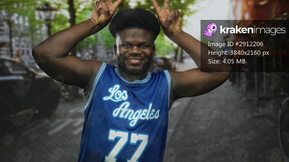 Man flashing peace signs with hands on head wearing blue los angeles jersey on street; playful joy smile.
