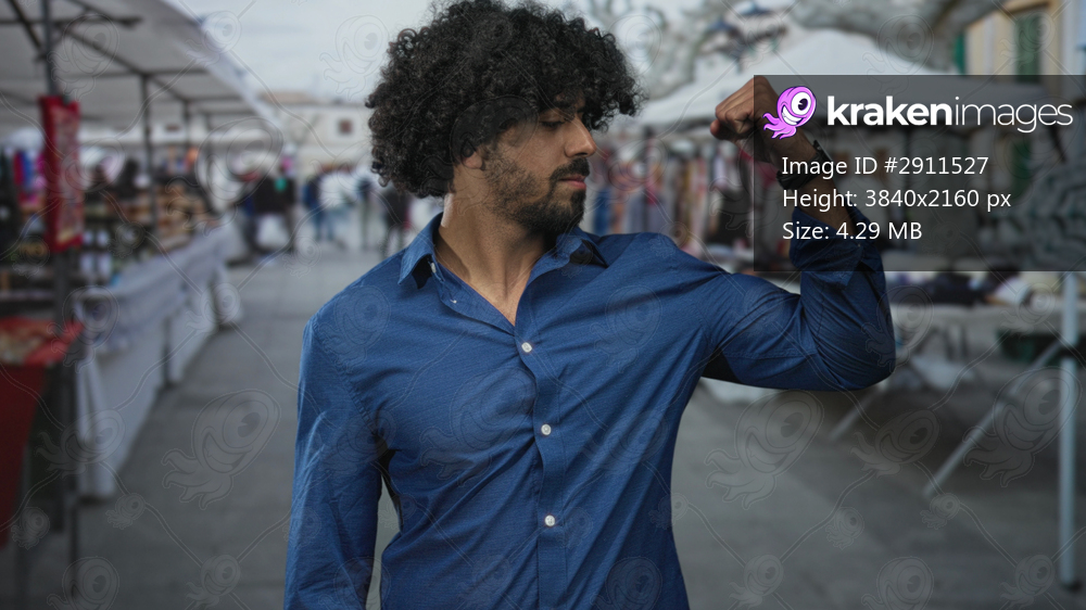 Man flexes arm with clenched fist amid street market stalls and souvenirs, curly hair visible and watch on wrist; confidence strength culture.