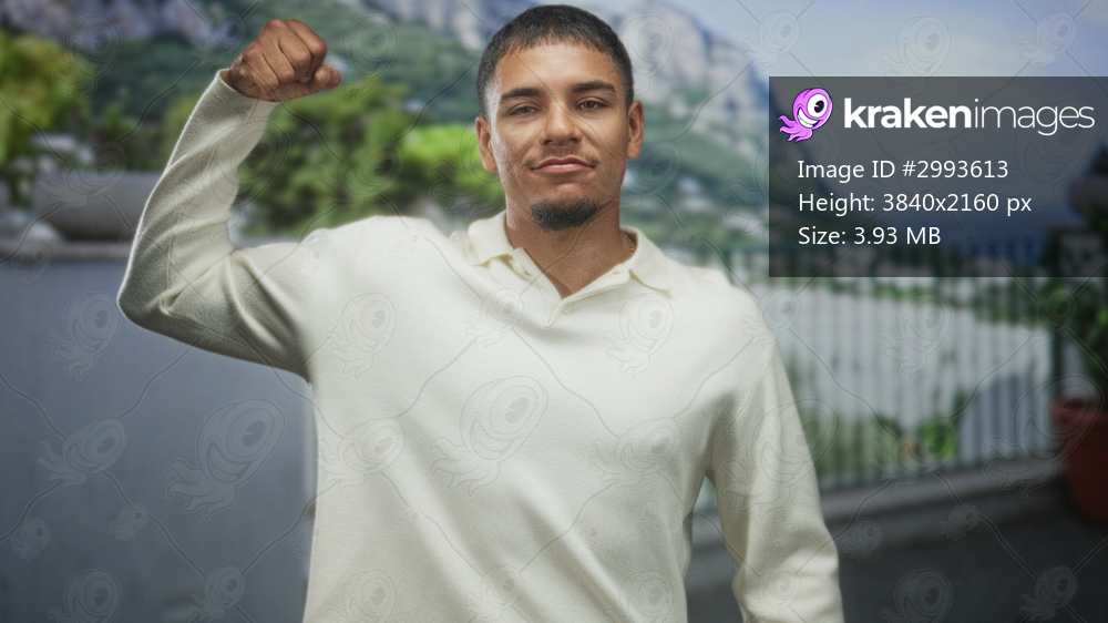 Man flexes arm with fist on building balcony wearing cream sweater, face and hand visible with slight smirk and confident gaze; confidence strength.