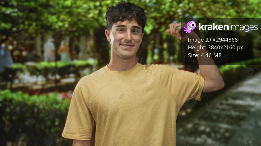 Man flexes arm and smiles on street among green park hedges and trees, wearing yellow tee and showing bicep in casual pose; confidence health.