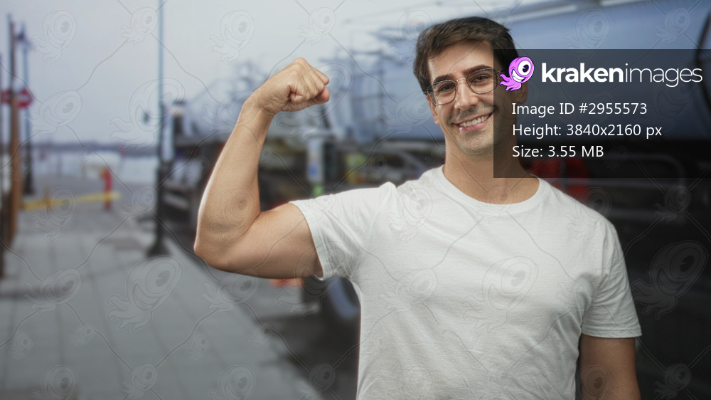 Man flexes bicep in a white tshirt on a street beside a tanker truck and sidewalk, smiling and posing to show muscle; confidence.