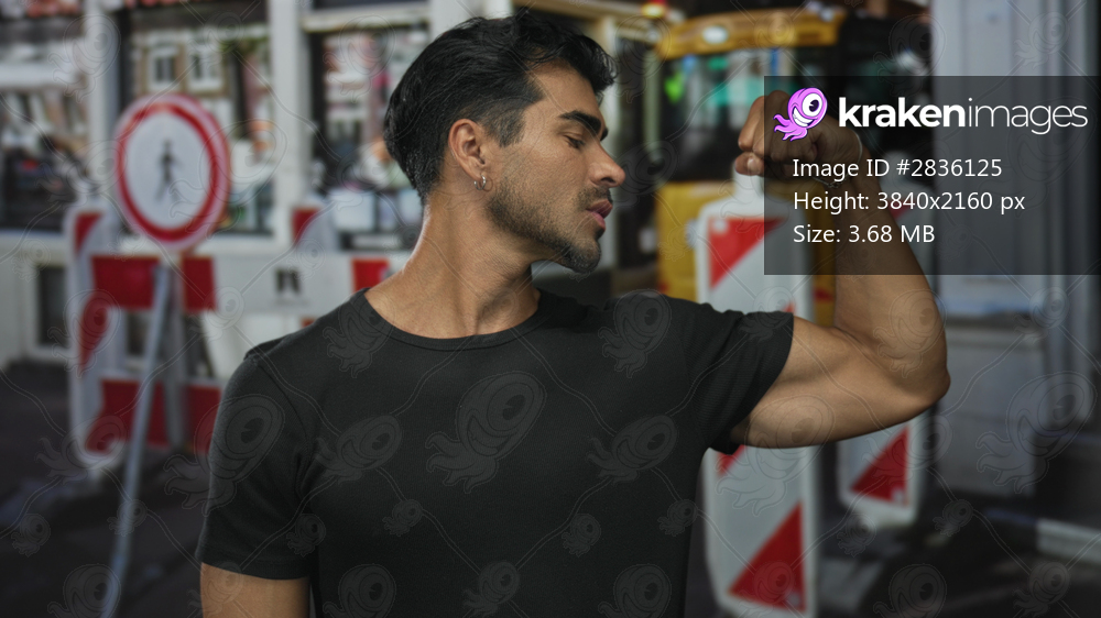Man flexes bicep on street next to traffic barrier signaling roadwork while viewing his muscle; confidence.