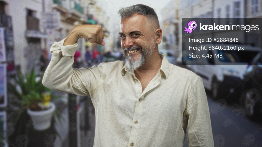Man flexes bicep and smiles, rolled sleeves reveal bare forearm, posing on a narrow city street with parked vans and potted plants; confidence.
