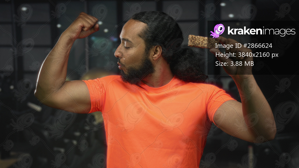 Man flexes bicep while holding a protein snack bar by his face in a gym building, wearing bright orange shirt and looking at the bar; health confidence. - Kraken Images