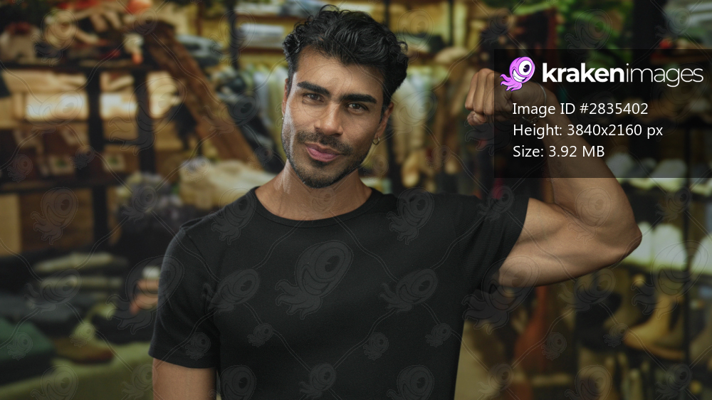Man flexes bicep while wearing a black shirt near clothing racks in a clothing shop inside a building; confidence.