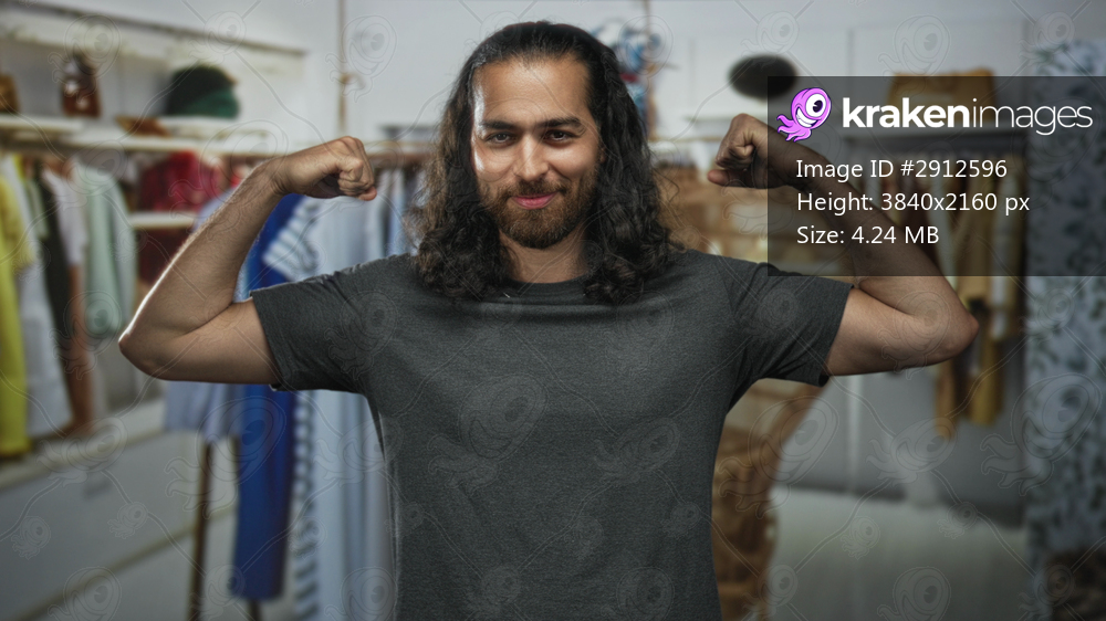 Man flexes biceps and forearms in a clothing store building, smiling at camera; confidence shopping fitness.