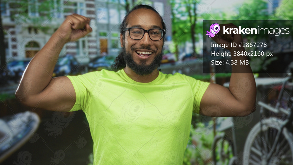 Man flexes biceps and raises fists on a street canal in amsterdam with bicycles and canal boats visible; victory confidence.