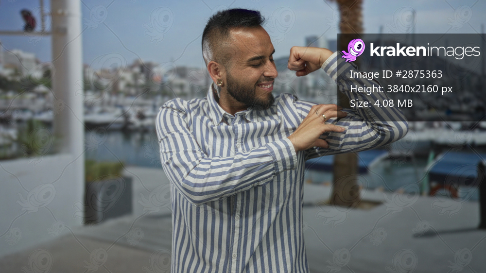 Man flexes biceps and smiles at port marina beside moored boats and palm tree on seaside quay; confidence achievement.