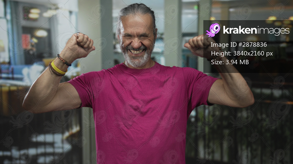Man flexes forearms with clenched fists inside a hotel building lobby, grinning with eyes closed; triumph joy.