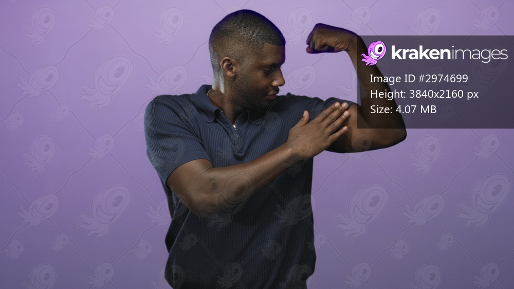 Man flexes right bicep and inspects his arm while posing against a purple seamless backdrop in studio; confidence strength.