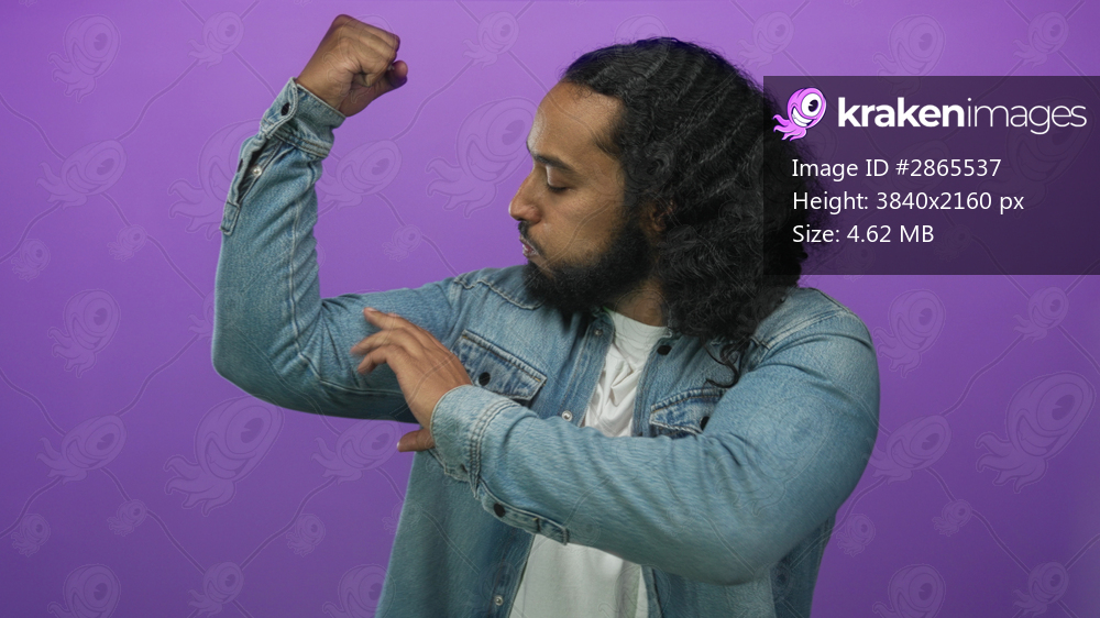 Man flexing arm in purple studio while checking his bicep and making a clenched fist; confidence empowerment.