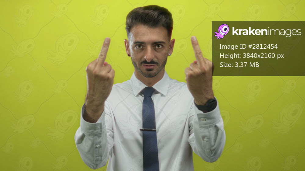 Man flips both middle fingers at camera in yellow studio wearing white shirt and tie; defiance rebellion.