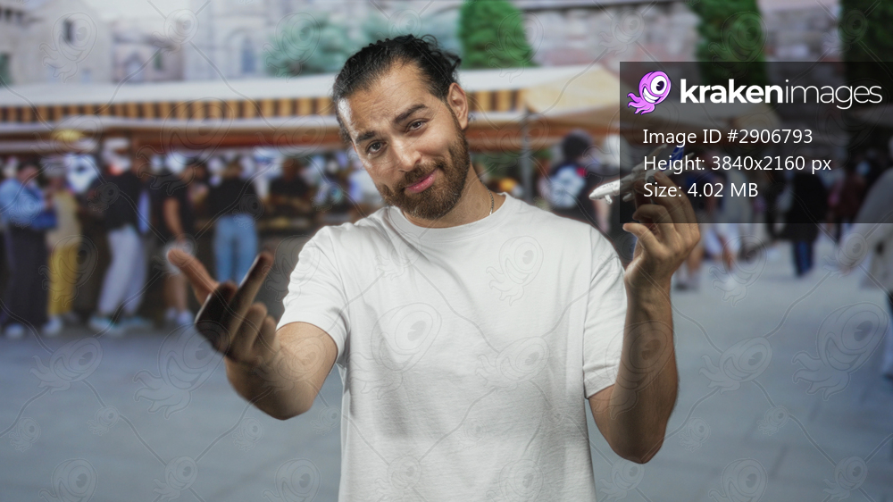 Man flips middle finger while holding a toy airplane at a crowded street market souvenir stall; defiance travel.