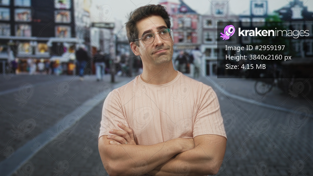 Man with folded arms and visible forearms wearing pale pink t shirt and glasses looking upward on a cobblestone street; thoughtful contemplation.
