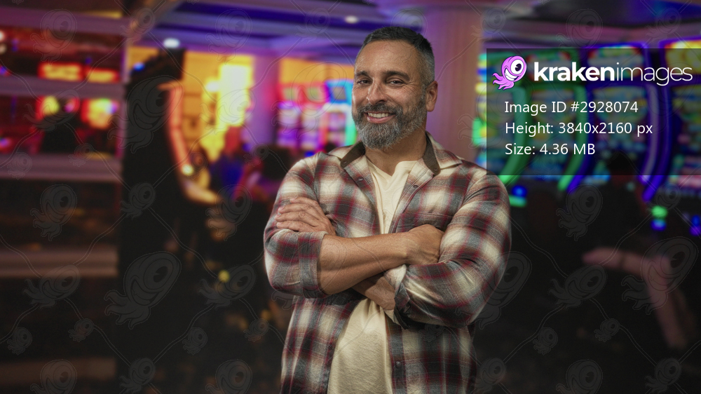 Man with forearms visible and arms crossed beside neon slot machines in a crowded casino building, smiling slightly at camera; confidence.