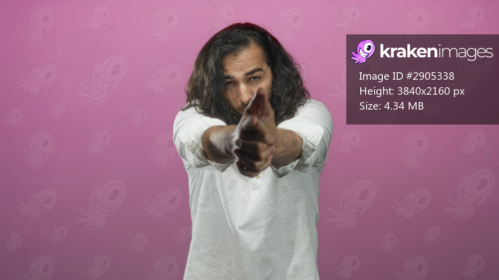 Man forming finger gun with both hands and direct gaze in pink studio closeup, wearing white shirt; focus determination.