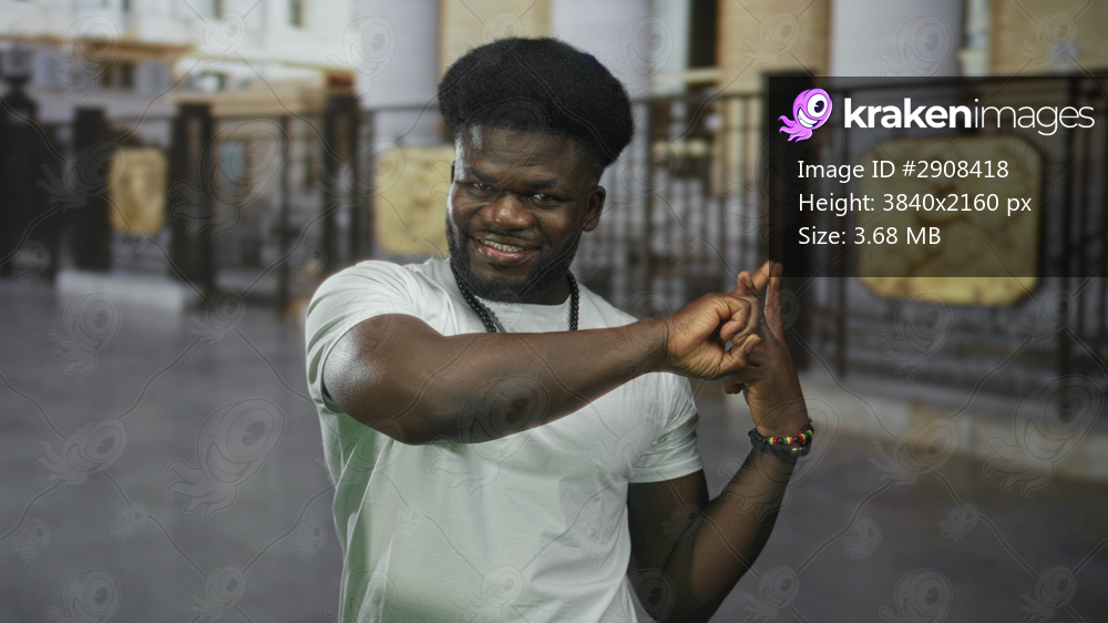 Man forming finger triangle with hands at ornate building railing outdoors, wearing white t shirt and beaded bracelets; confidence energy.