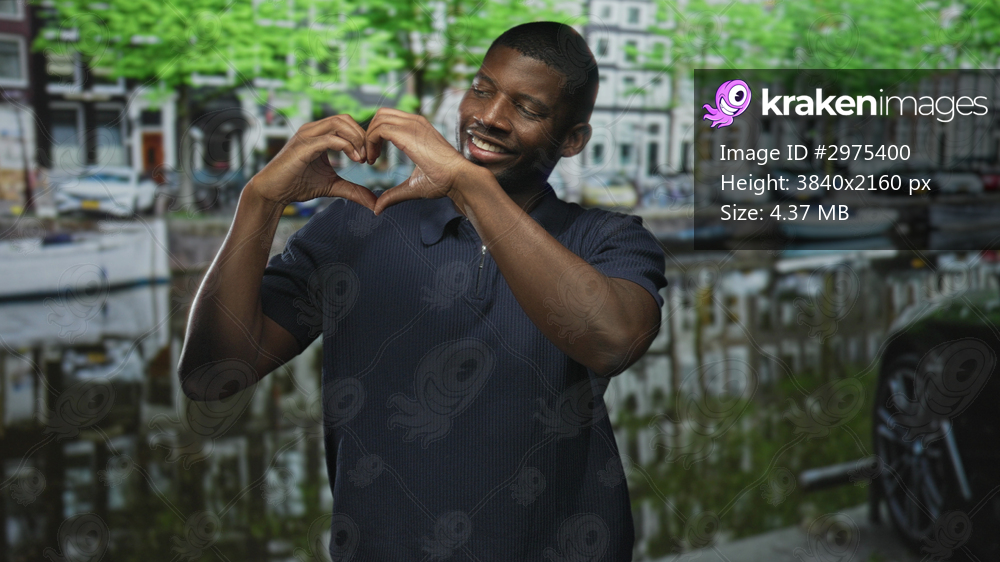 Man forming heart with hands on street by canal beside parked car and boat, smiling gently; affection warmth connection.