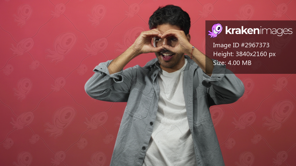 Man forming heart with hands over eyes while peering and smiling in a pink studio, wearing gray shirt and rolled sleeves; playful affection.
