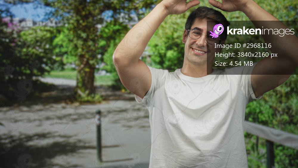 Man forming heart with hands, smiling, arms raised, wearing white t shirt in park; joy affection warmth.