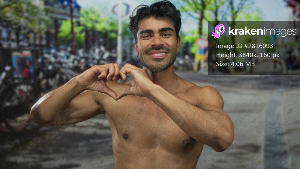 Man forming heart shape with hands over shirtless chest on sunlit street while smiling; love connection.