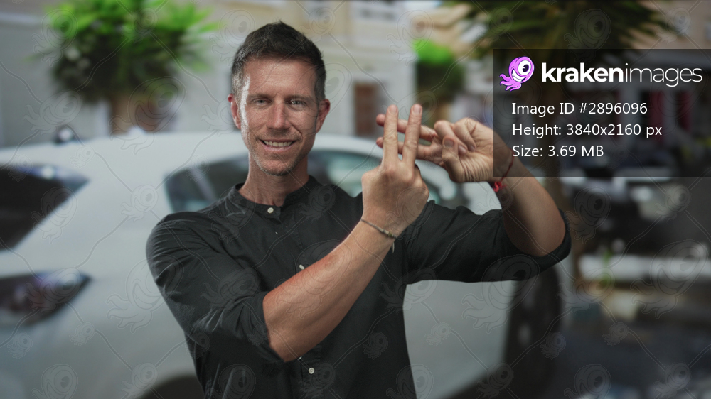 Man forms hashtag with fingers while smiling on a residential street by a parked car and house entrance; social connection playful.