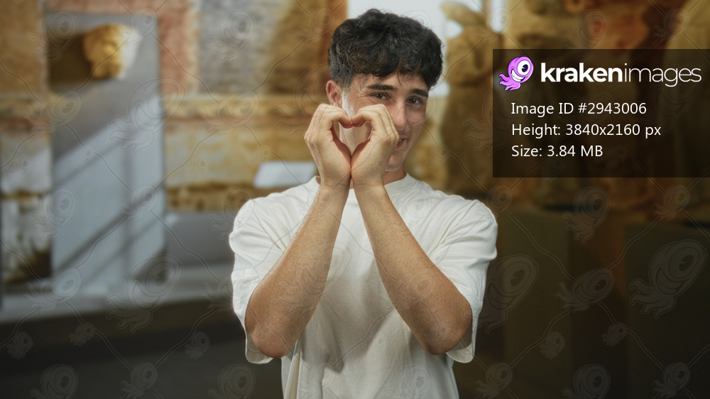 Man forms heart with hands in museum gallery near classical stone statues and plinths; youthful affection.