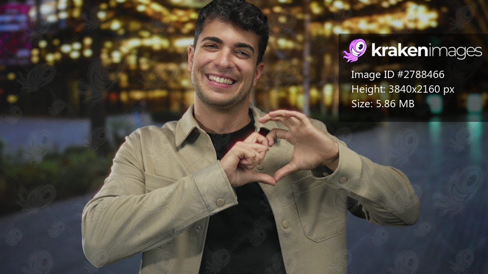 Man forms heart shape with hands at downtown plaza; love affection happiness joy.