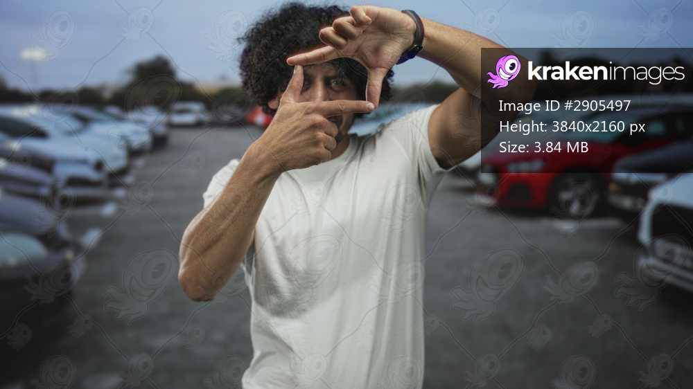 Man forms rectangular frame with fingers and points finger at camera on street parking among cars while wearing white tee; playful creativity.