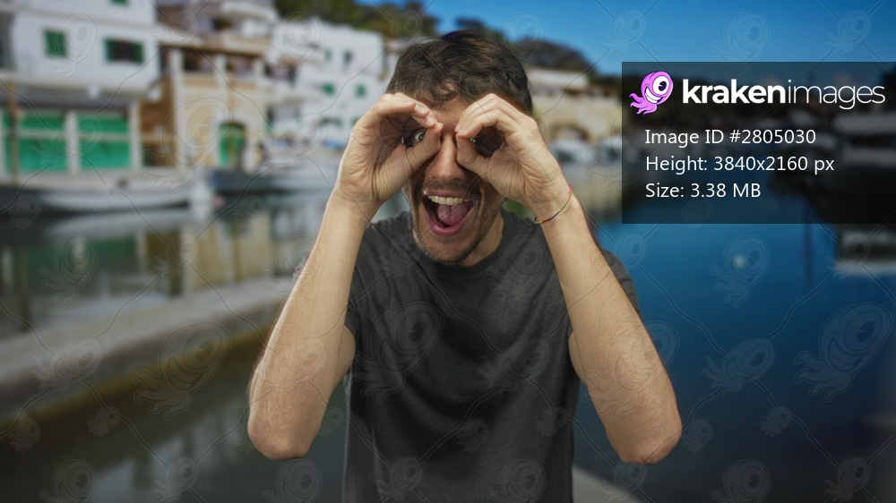 Man frames eyes with fingers and opens mouth at sunny port by moored boats; joyful curiosity exploration.