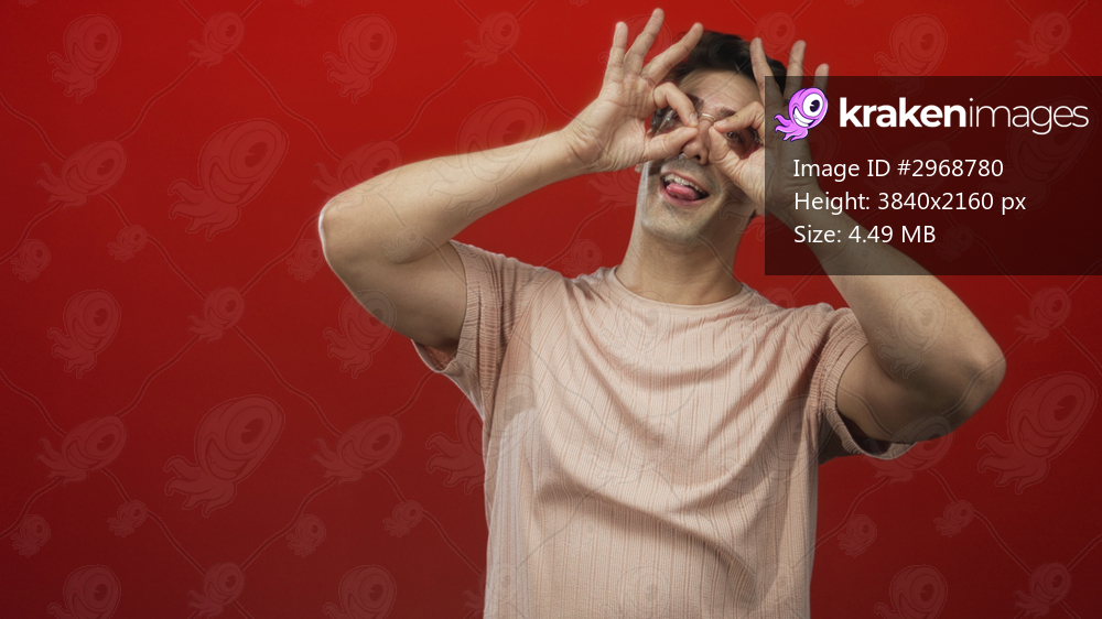 Man frames eyes with ok hand gesture while wearing glasses and a beige t shirt in red studio; playful silliness.