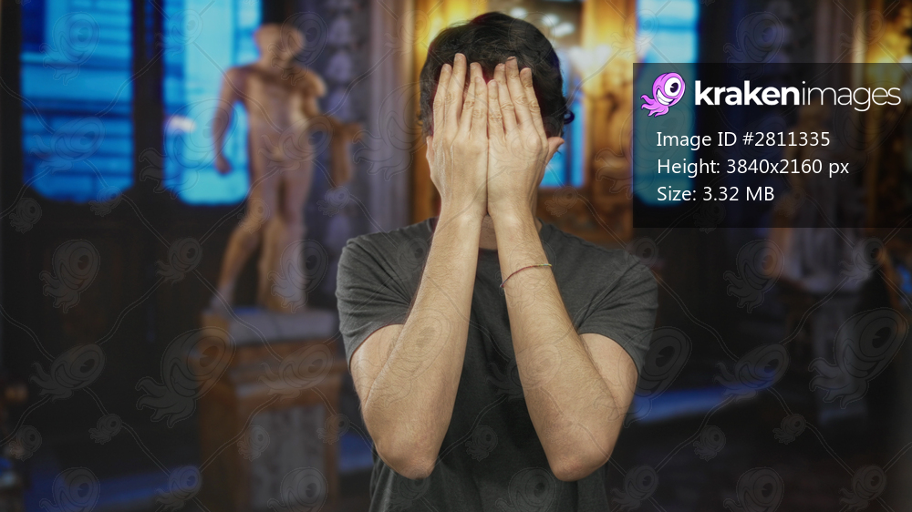 Man frames face with hands amid ornate marble sculptures in grand museum gallery lit by chandeliers; surprise.
