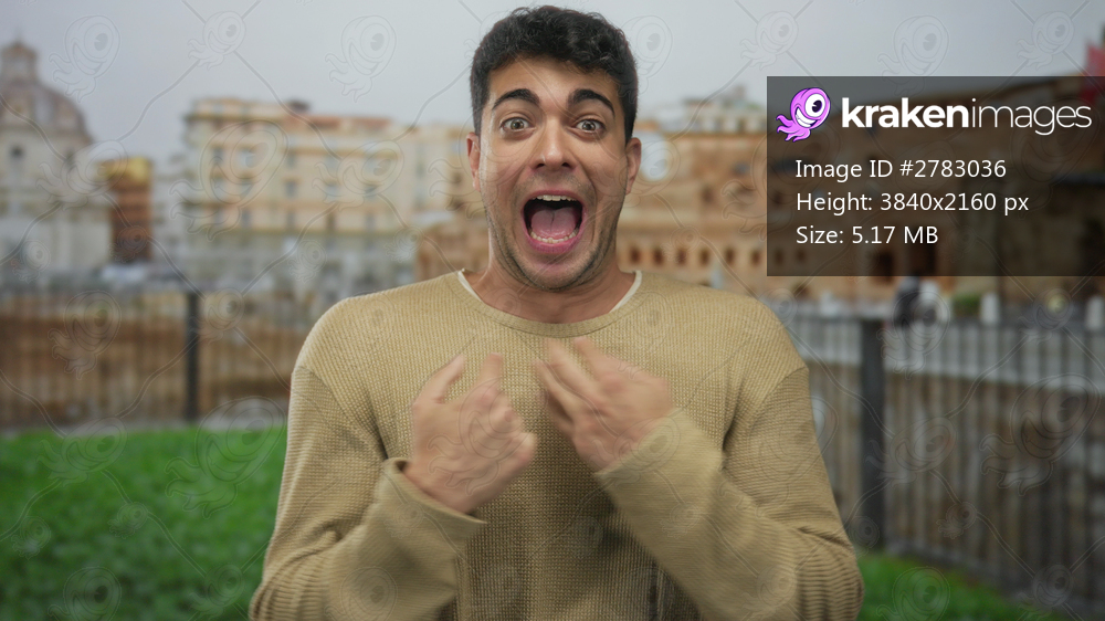 Man frames hands clasp rome backdrop while young hispanic tourist outdoor guy smile radiates happiness.