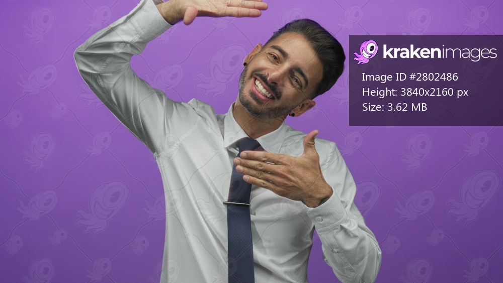 Man frames his broad smiling face with hands in a vibrant purple studio while wearing a white shirt and navy tie; playfulness.